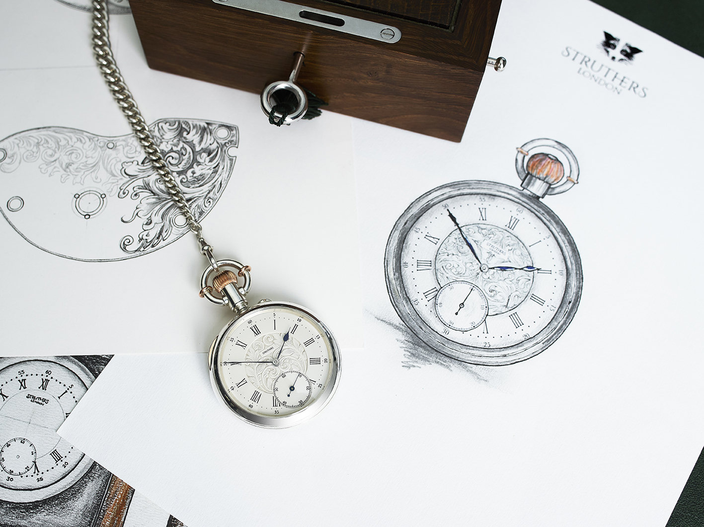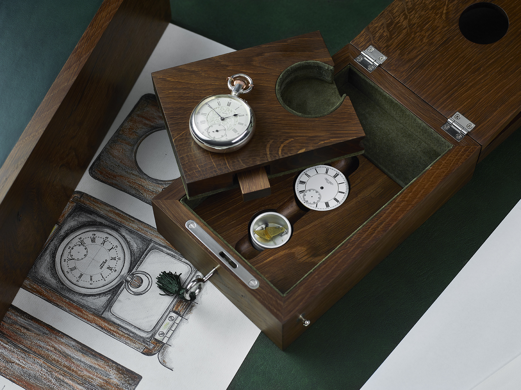 this watch iss presented in a case handmade in Scotland by award-winning bespoke designers and cabinetmakers Method Studio, along with a concealed USB with extensive photographic documentation of the creation of the watch and original components from the recommissioned movement