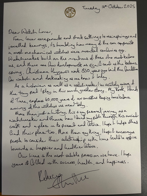 To commemorate the anniversary, Rebecca, along with several other independent watchmakers who continue Huygens’ legacy, was invited to contribute a handwritten letter reflecting on her philosophy of watchmaking and the significance of this moment in horological history.