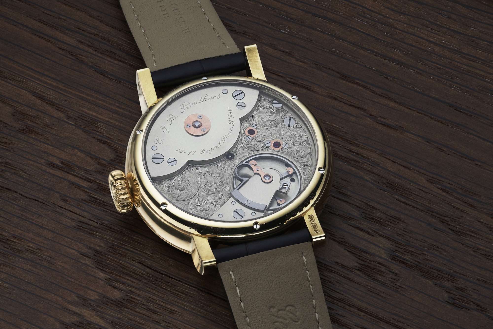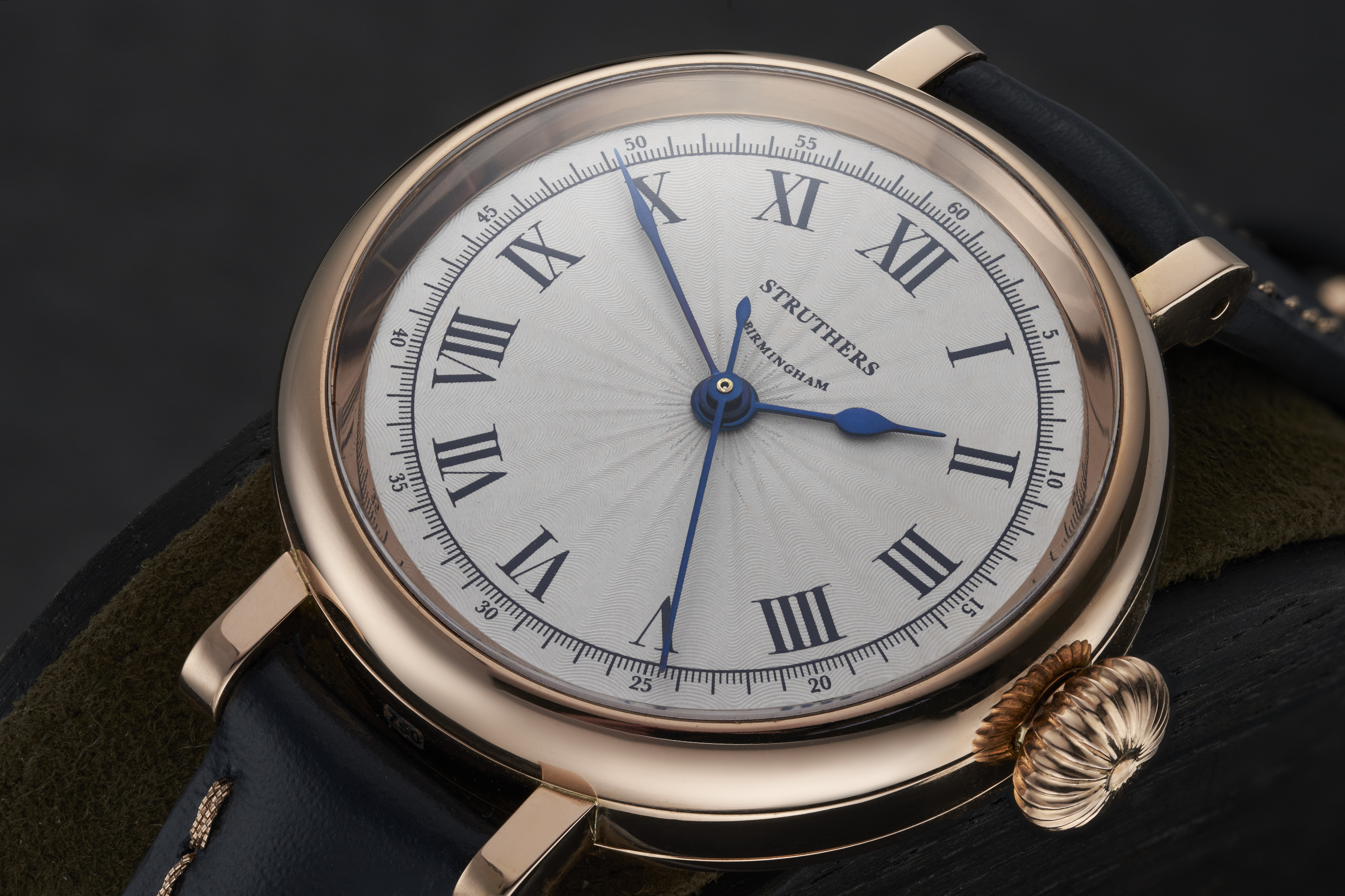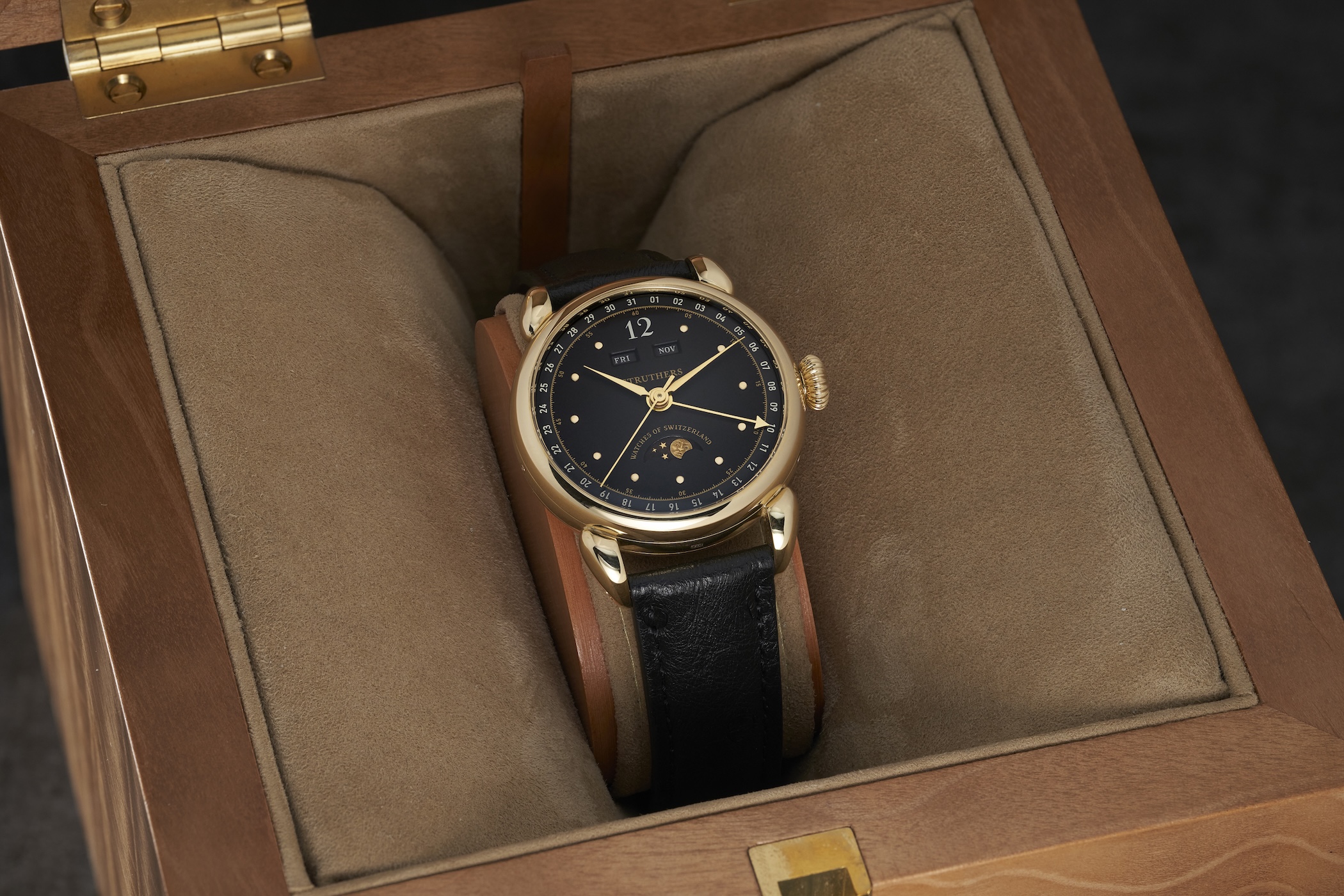 Each version of the Kingsley is unique and we're delighted to share the latest edition featuring a blued steel and 24 carat gold inlaid moon phase wheel to accent the blued calendar ring and applied gold pip markers.